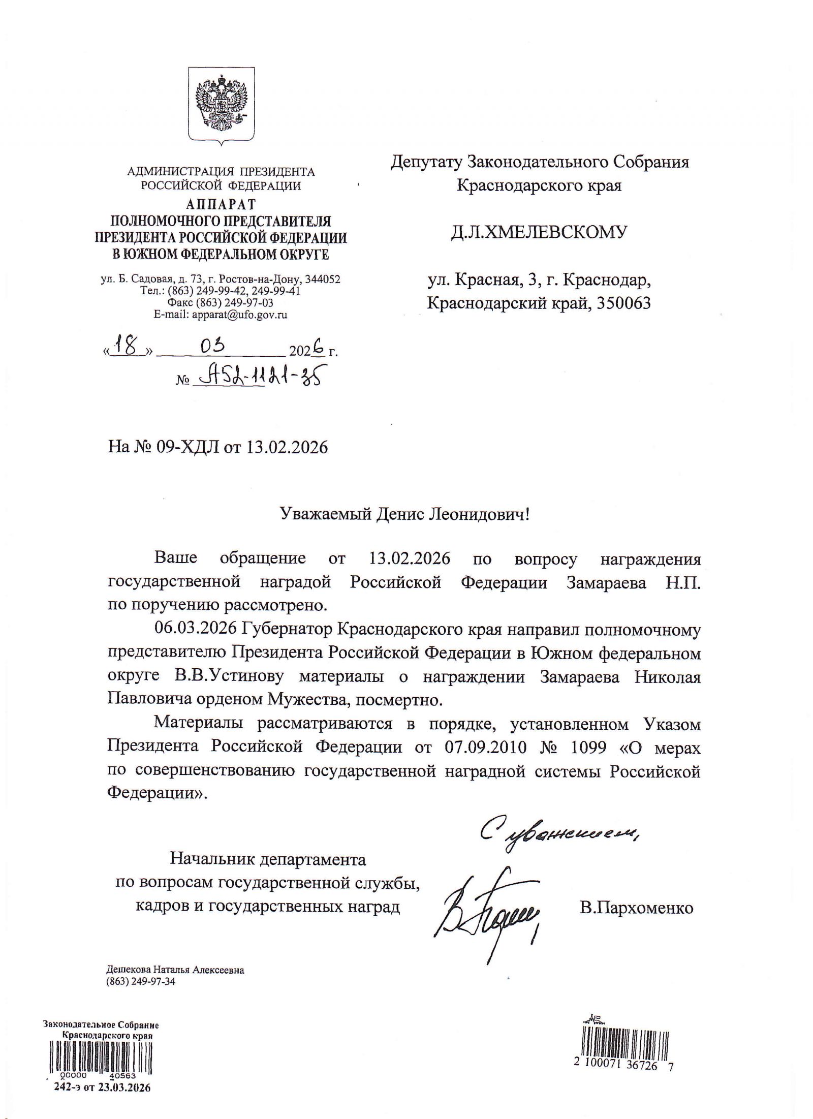"Аппарат полномочного представителя Президента РФ в ЮФО рассмотрел моё обращение о награждении Николая Замараева Орденом Мужества посмертно.